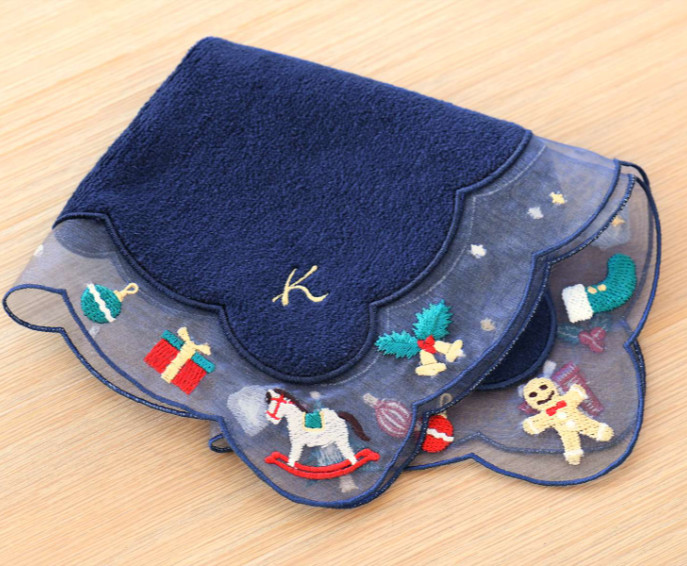 透け感のある軽やかなオーガンジーで縁取った華やかなタオルハンカチ。 オーガンジー部分にはジンジャーブレッドマンやオーナメントなど、クリスマスモチーフを贅沢に刺繍であしらいました。 ご自身用はもちろん、ギフトにもおすすめです。