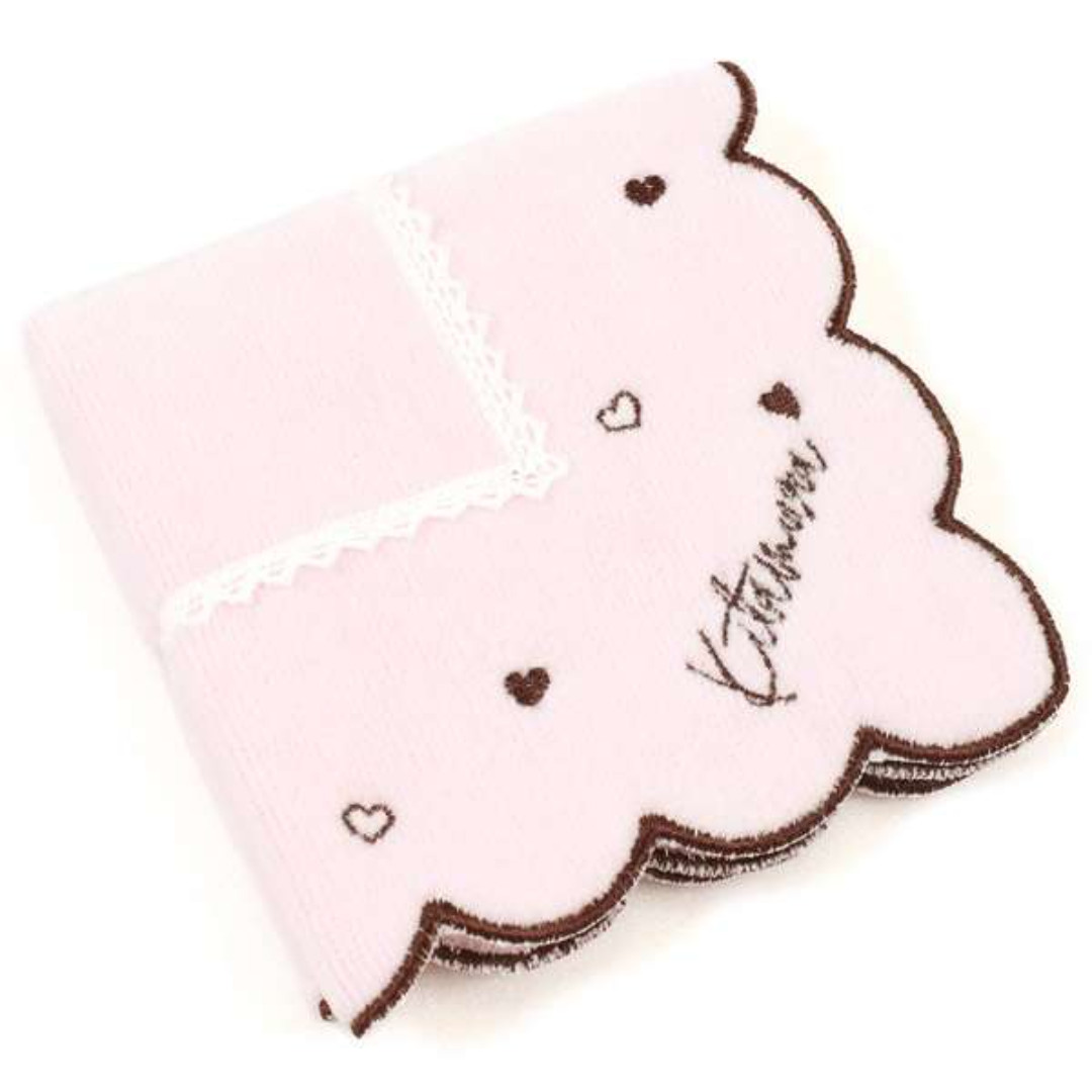 ハート刺繍をちりばめたスカラップカットのタオルハンカチ。中央にはレースをあしらい、可愛らしさをプラスしました。右下に手書き風キタムラロゴ刺繍が入っています。