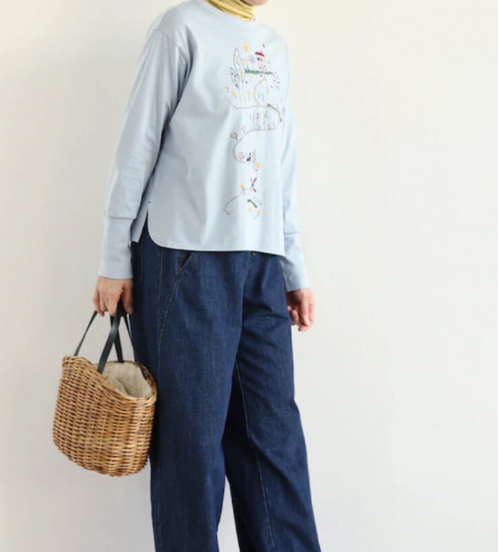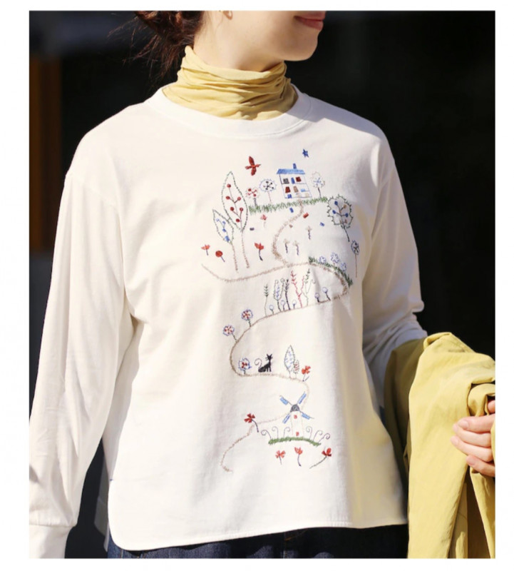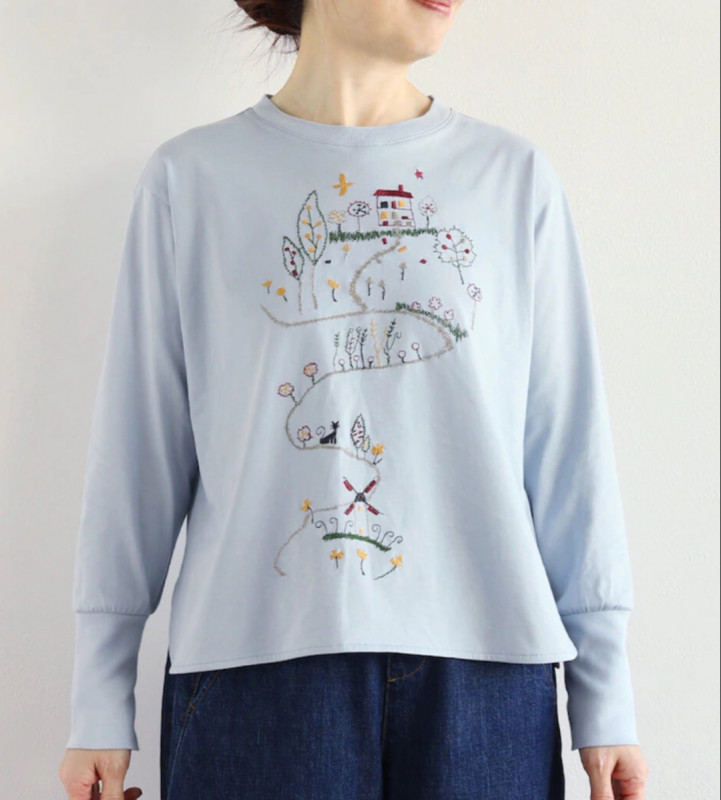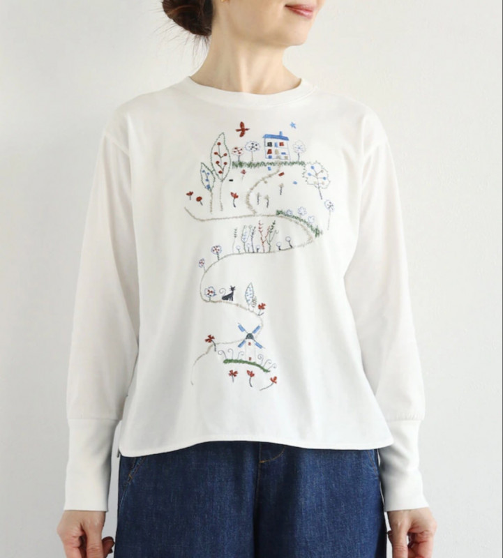 布の上に描かれた、小さな物語。 日々の暮らしの中にある穏やかなひと時と、ねこの散歩道をイメージした刺繍がやさしく映えるプルオーバーです。
