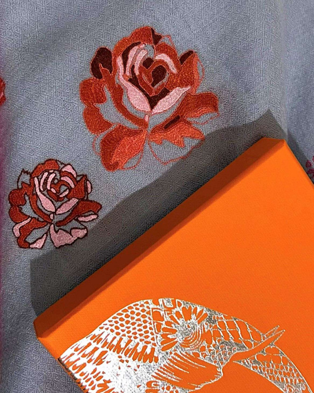 淡いブルーの一枚は高島屋のシンボルである薔薇の刺しゅうに、その周囲を舞う蝶をあしらい、職人たちの姿を重ね合わせた特別なデザイン。