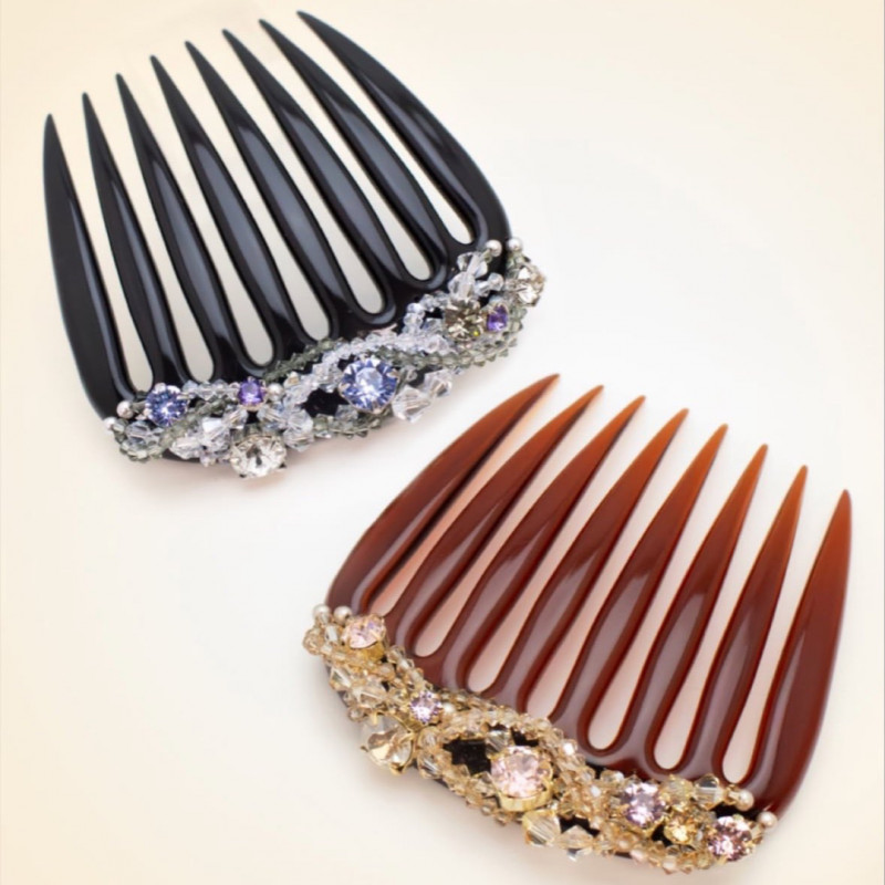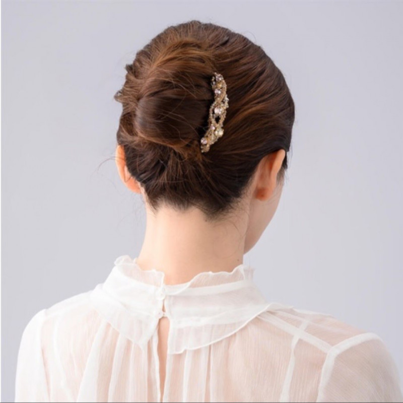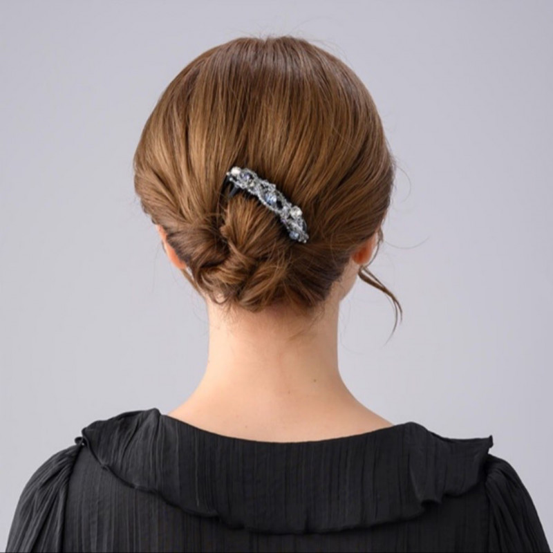 立体的に編み込まれたさまざまなサイズのスワロフスキー®・クリスタルに魅せられる華やかなフレンチコーム♪