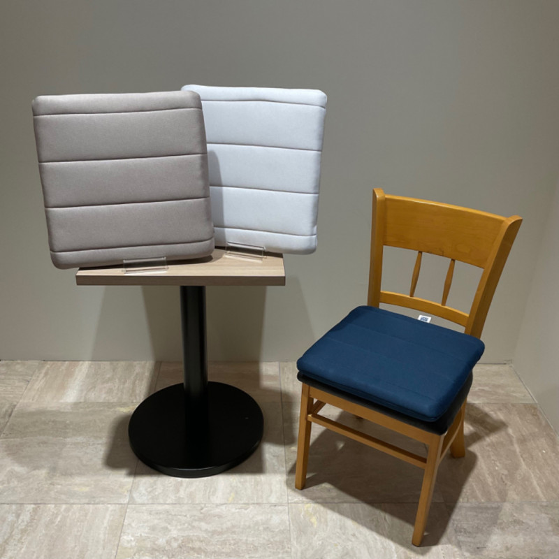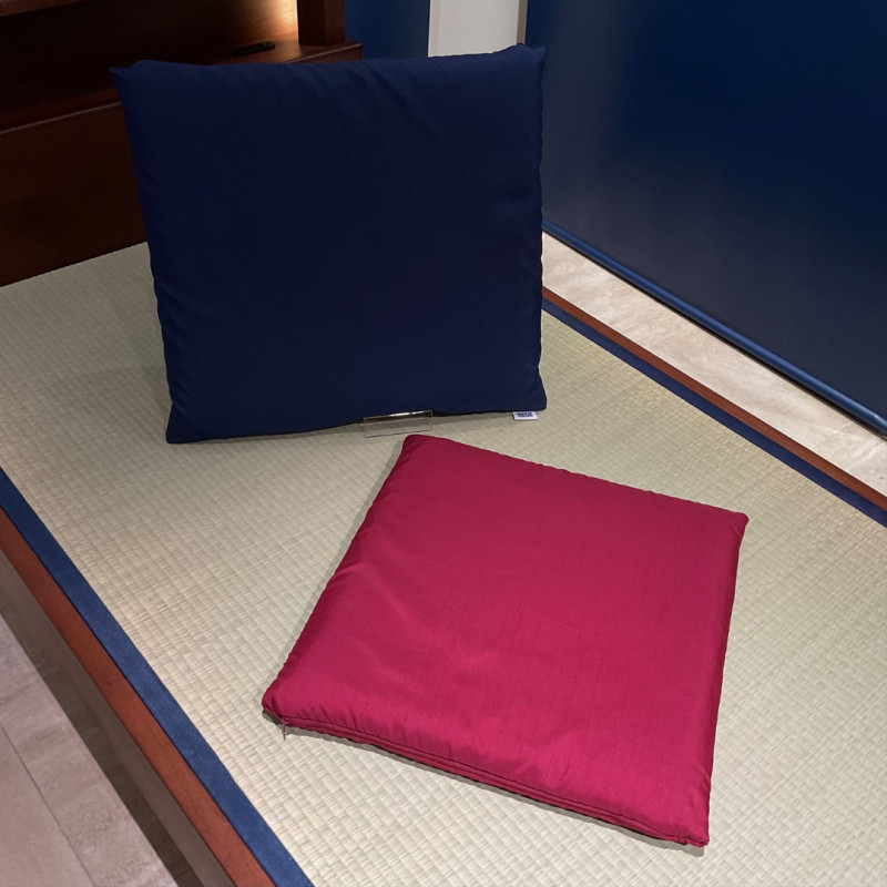 クッションはグレー/ネイビー/ホワイトの3色、座布団はネイビー/ワインレッドの2色展開。