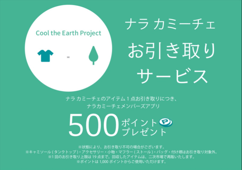 ナラ カミーチェのアイテム1点お引き取りにつき、ナラ カミーチェメンバーズアプリのポイントを500ポイントプレゼントいたします。