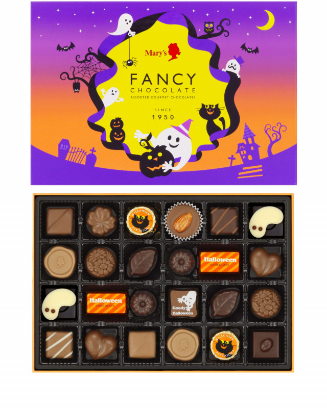 ハロウィンデザインの箱を開けると、にぎやかに並ぶチョコレートが登場。