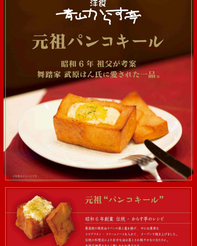千代田区麹町の老舗洋食店「青山からす亭」の初代オーナーシェフが1931年に考案した「パンコキール」は箱型食パンを素揚げして中に海老や野菜、白ワインの旨味を閉じ込めたベシャメルソースと卵を入れオーブンで焼き上げた贅沢な味わいの洋食メニュー。