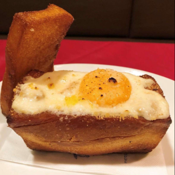 「パンコキール」は箱型食パンを素揚げして中に海老や野菜、白ワインの旨味を閉じ込めたベシャメルソースと卵を入れオーブンで焼き上げた贅沢な味わいの洋食メニュー。