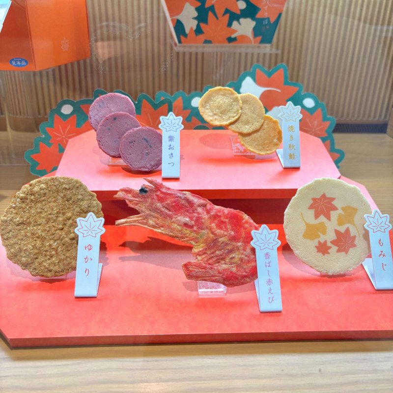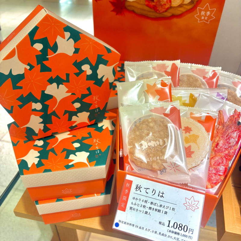 ゆかりをはじめとした5種類のおせんべいが入っており、紅葉のイラストが印象的なパッケージです。