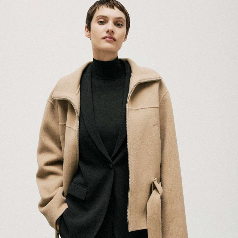 高めに設定された襟とウエストベルトがスタイリングのアクセントになる、クリーンなシルエットのアイテムです。