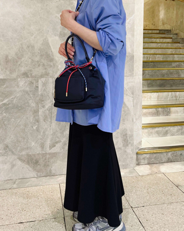 二本のドローストリングコードとゴールドのメタルパーツが目を惹く、巾着型のショルダーバッグです。
