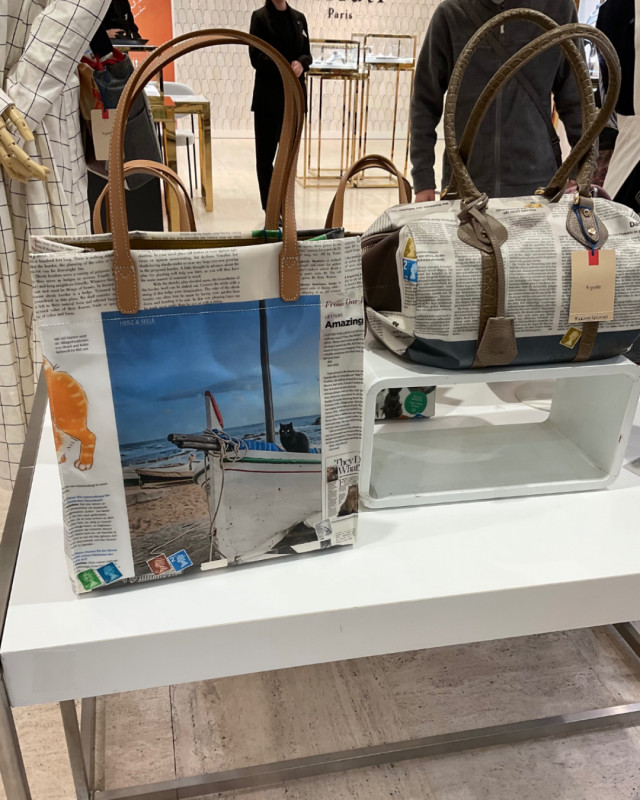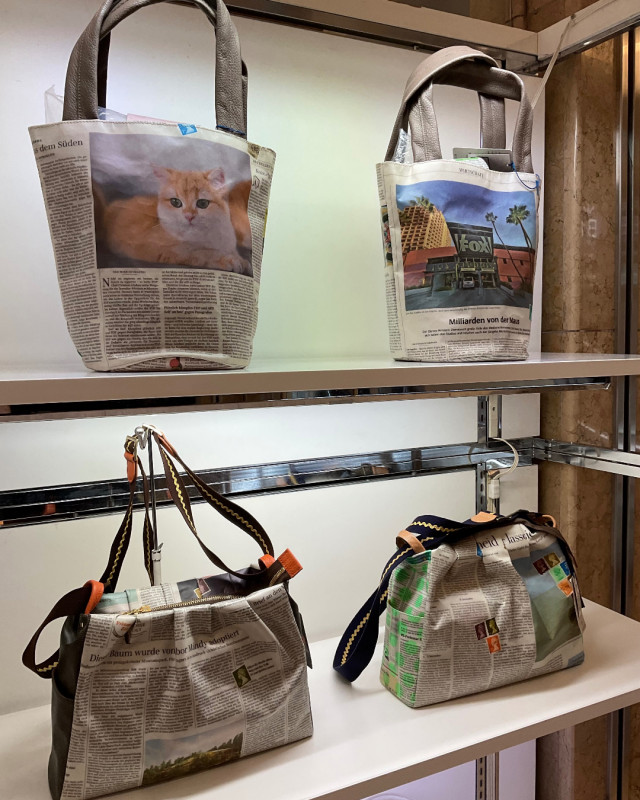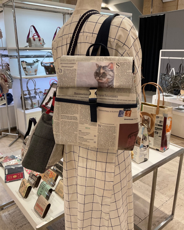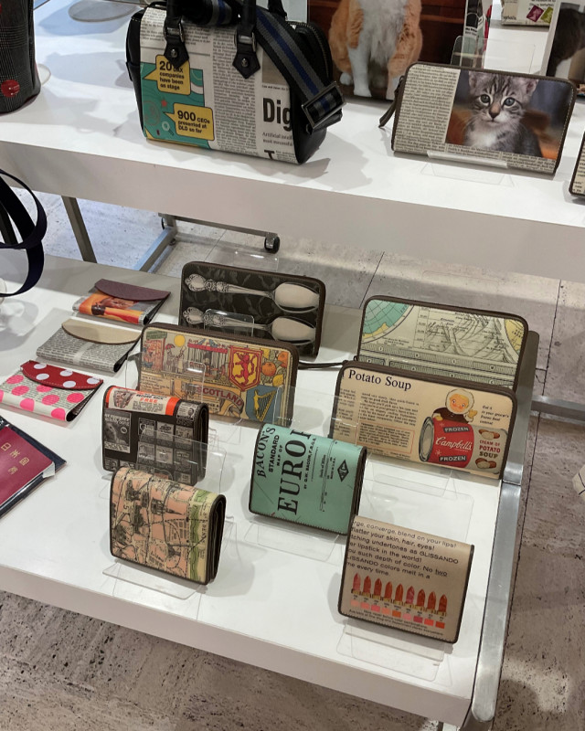 本物のヨーロッパの新聞や雑誌に特別なコーティングを施し、一点物のバッグやお財布に仕立てている [アグリ]。