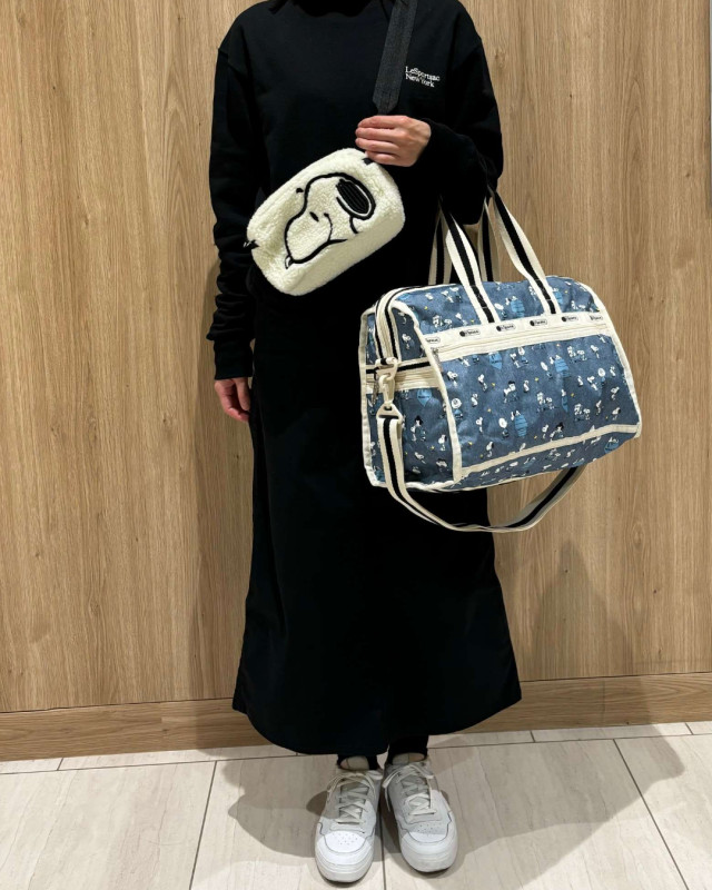 スヌーピーと個性あふれるキャラクターたちが集まった賑やかな総柄と、ボア生地を使用した季節感あふれるスタイル。
