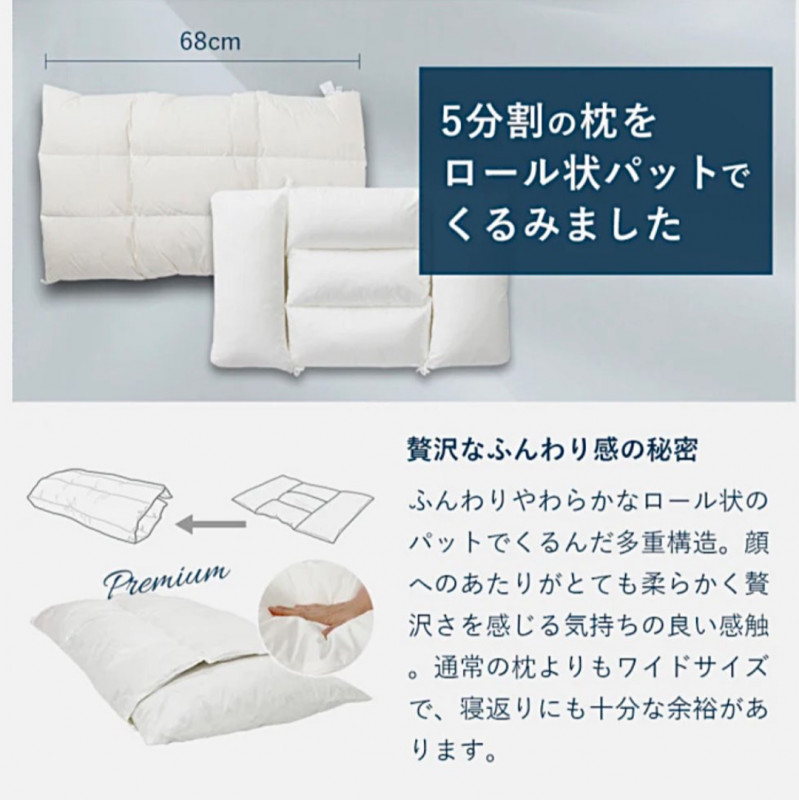 ホテルサイズのふっくら枕で贅沢におやすみいただけます。頭を乗せた感触やお顔に触れる感触がふっくらふんわりで心地の良い枕です。ふんわりした感触でありながら、中の5分割構造により素材が片寄らず、一晩中、仰向け・横向き・寝返りをサポートしてくれます。