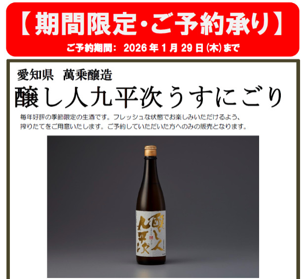 【『 醸し人九平次 うすにごり 』予約販売のお知らせ 】