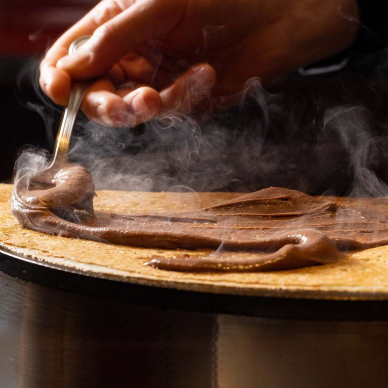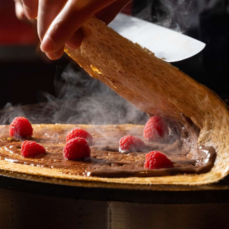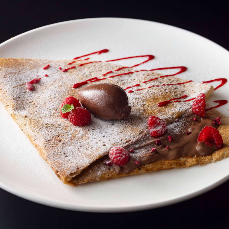 そば粉100%の香り豊かなガレットを店内で焼き上げ、濃厚なショコラのパティシエールと甘酸っぱいフランボワーズを合わせた期間限定のデザートです。