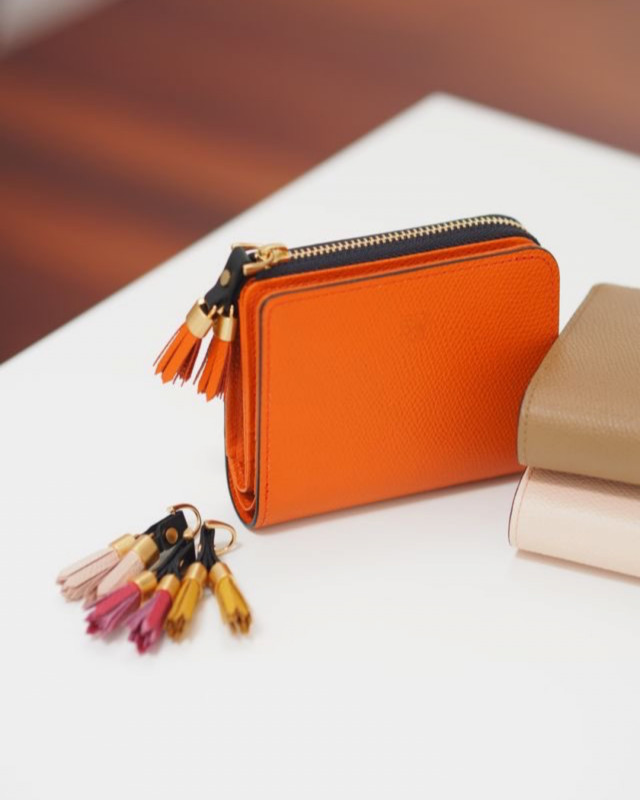 折財布14色と引手のタッセルチャーム14色から、お好きな組み合わせをお選びいただけます。
