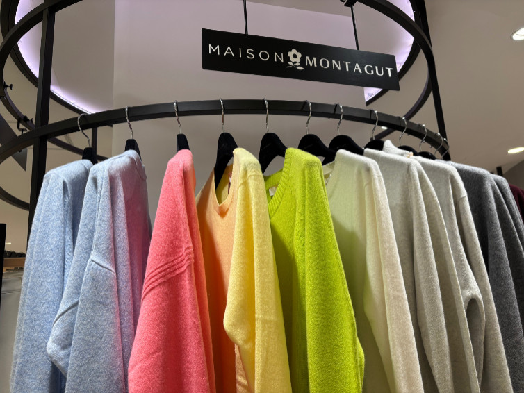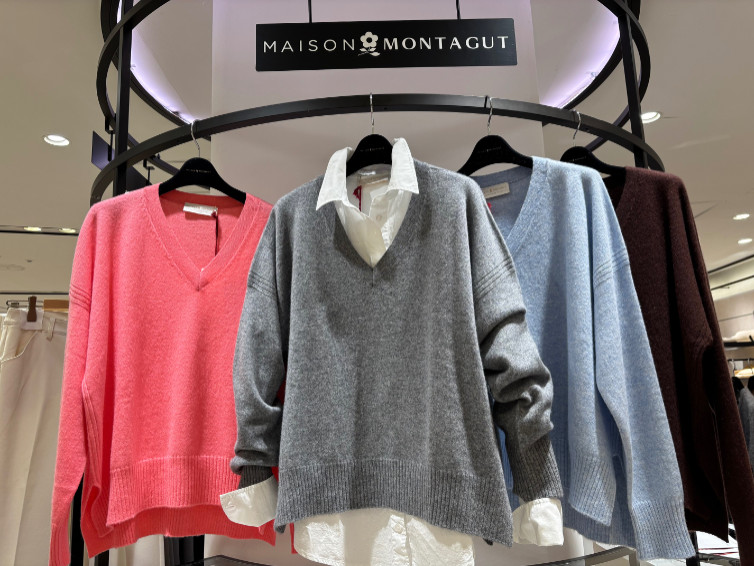 鮮やかな色合いに仕上げたメゾンモンタギュのカシミヤ100%のニットです。
