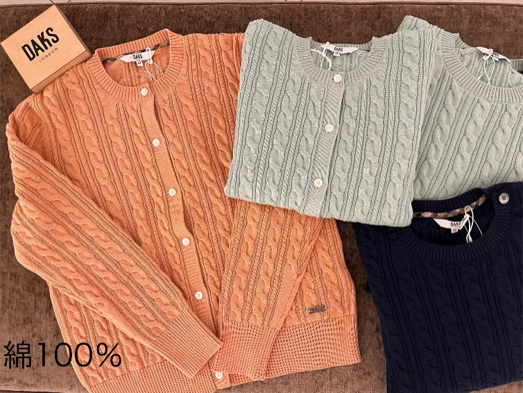 素肌にも心地よい、綿100%のケーブルカーディガンとニットです。