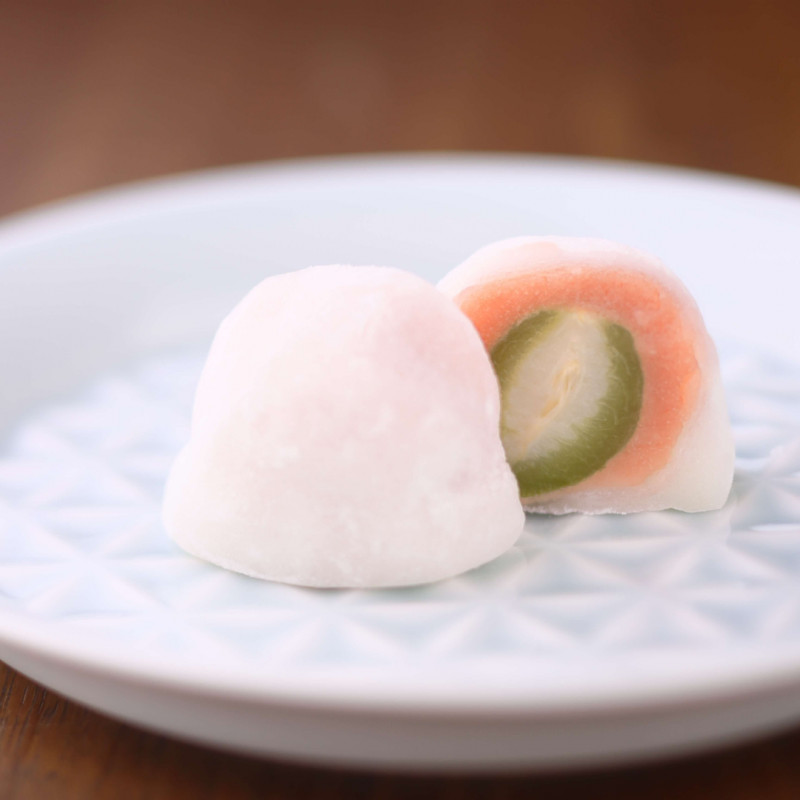 若いうちに収穫した桃の実「若桃」を甘く漬け、桃色の餡で一粒ずつ丁寧に、花嫁のわたぼうしに見立てたふうわりとした求肥にくるみました。清々しい香りとともに、若桃は種ごとお召し上がりいただけます。