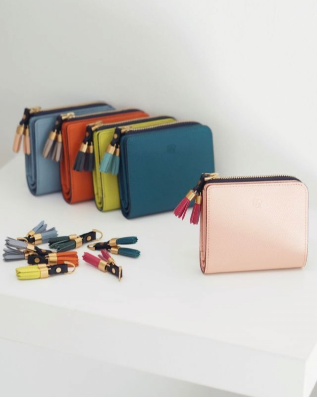 折財布14色と引手のタッセルチャーム14色から、お好きな組み合わせをお選びいただけます。