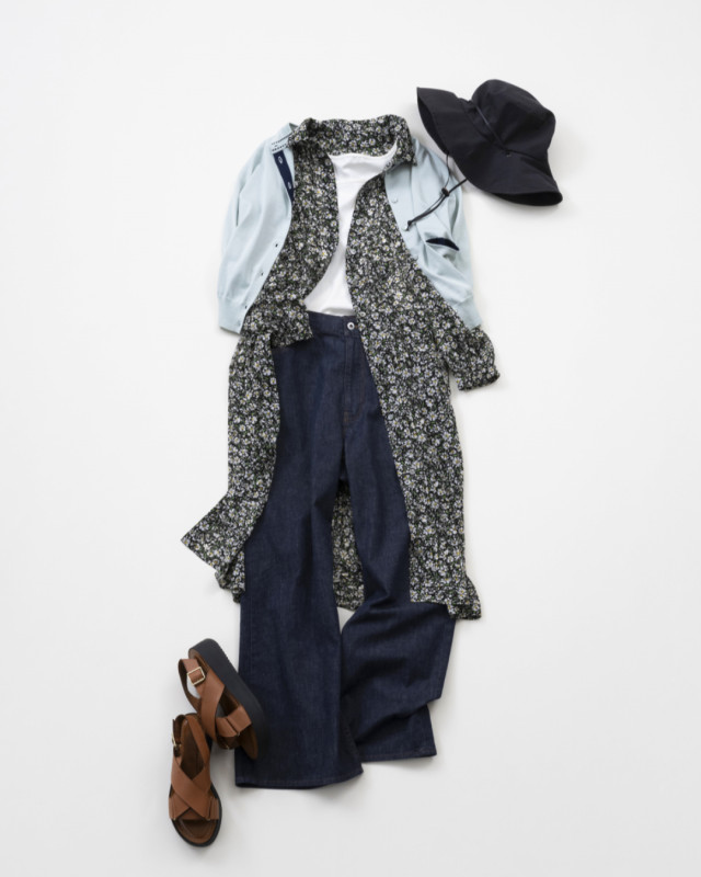 レトロな小花柄が可憐なプリントワンピースを羽織としてアレンジ。