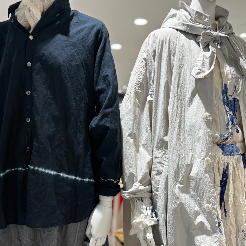藍染め、ラピスラズリ染め、絞りなど様々な技法を用いて染色されているアイテムが多数ございます。ぜひご覧くださいませ。