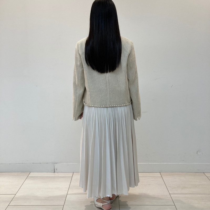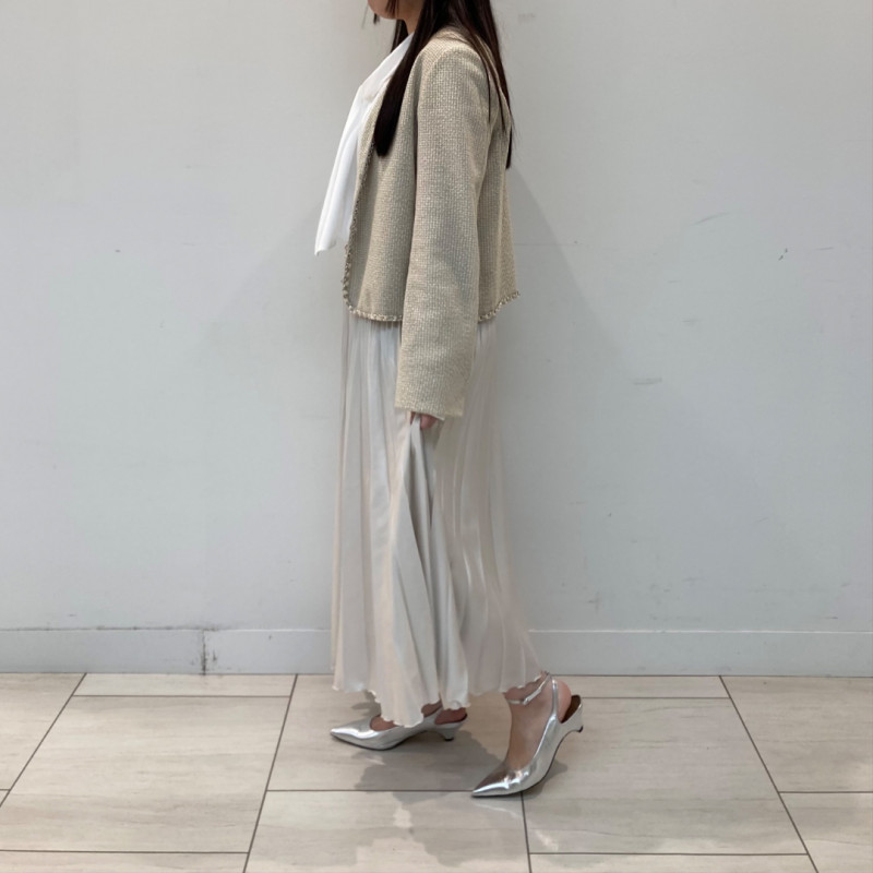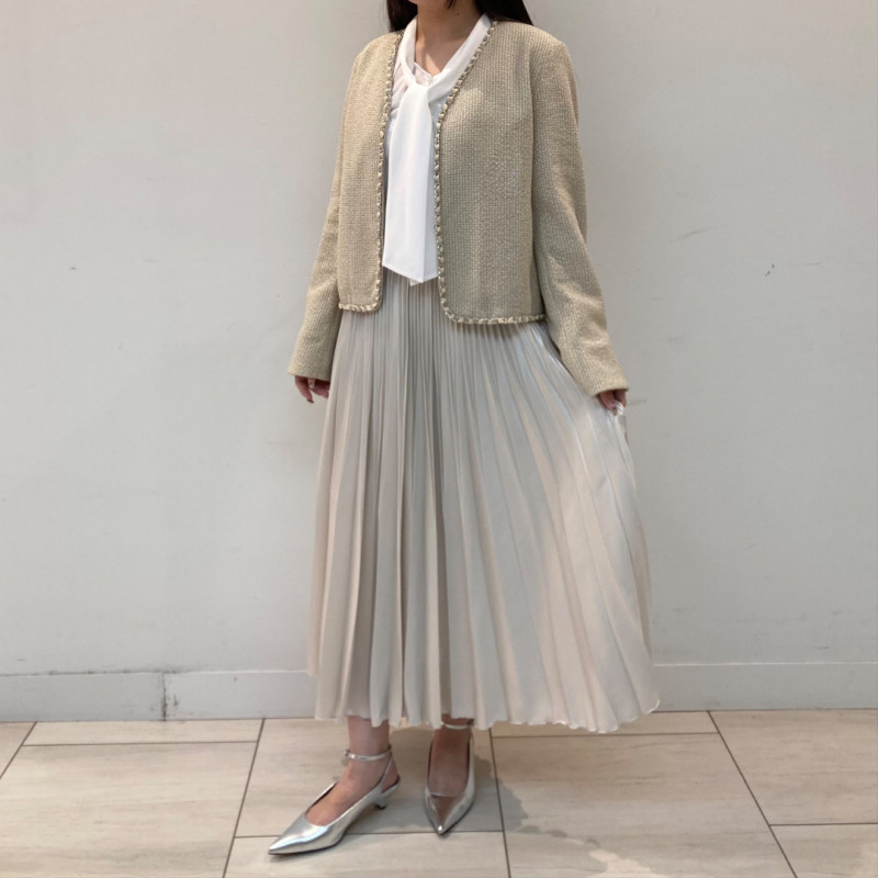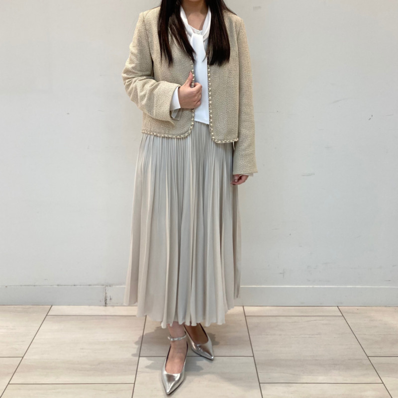 ベージュのワントーンでまとめ、春らしさを表現しました。オケージョンにも着用いただけるスタイリングに仕上げました。