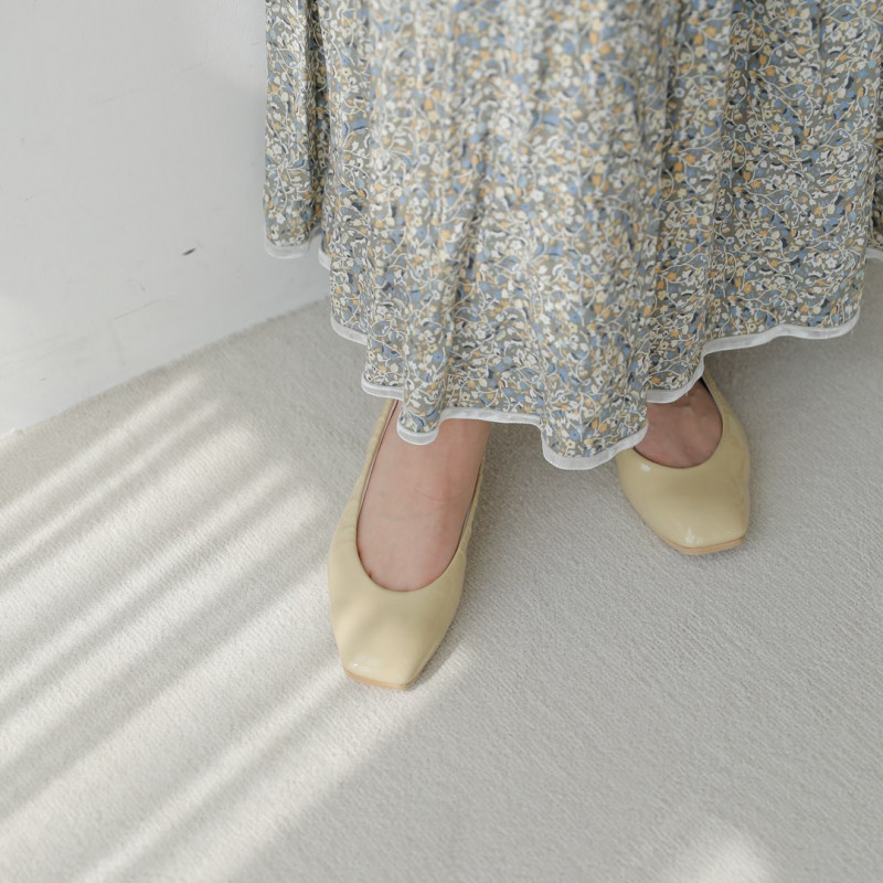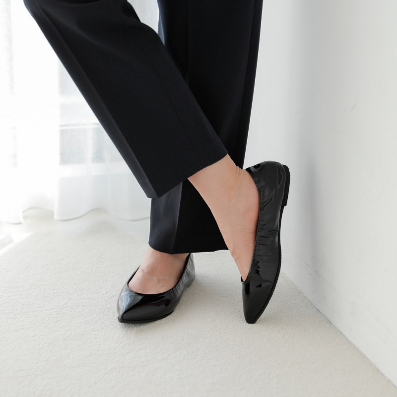 リボンや履き口のゴム、踵部分のテープをあえてなくしたミニマルなデザインがソフトエナメルの上品な艶感を引き立て、コーディネートをスタイリッシュに格上げしてくれます。