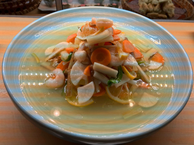 今話題の八丈島のレモンのやわらかな酸味を生かして海老と野菜のマリネを仕上げました。