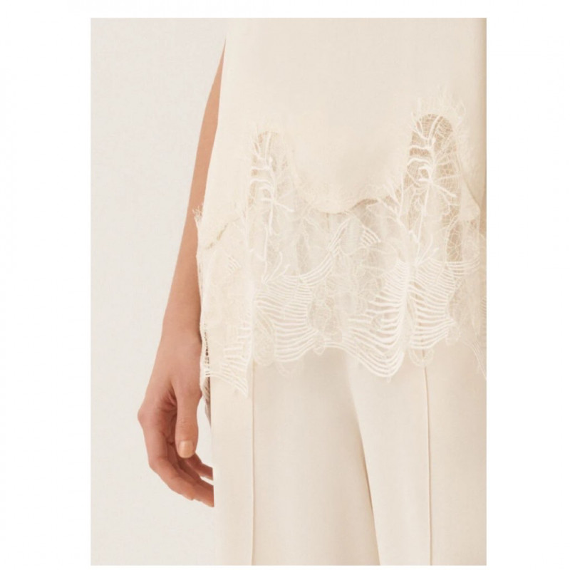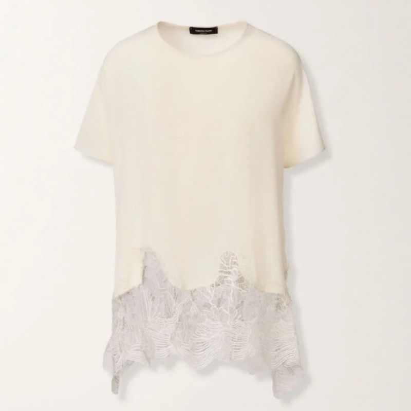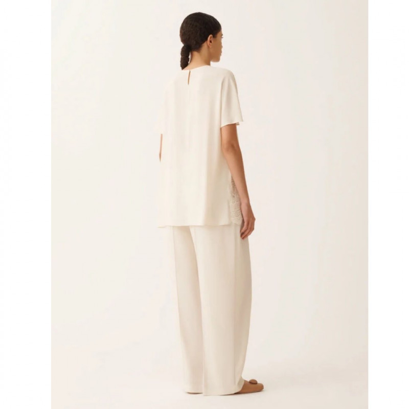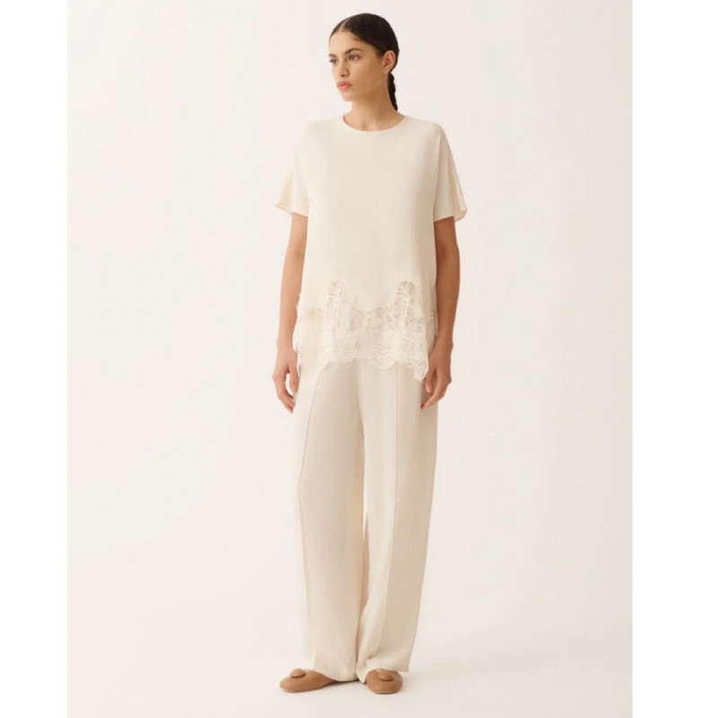新しいシルク混クレープデシンで作られたショートスリーブトップスは、洗練された洗い加工の仕上がりが特徴です。マットな質感と流れるような手触りがシルエットを包み込み、自然な女性らしさを引き立てます。裾には上品なレースがあしらわれてきます。