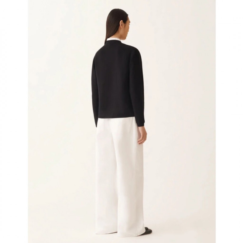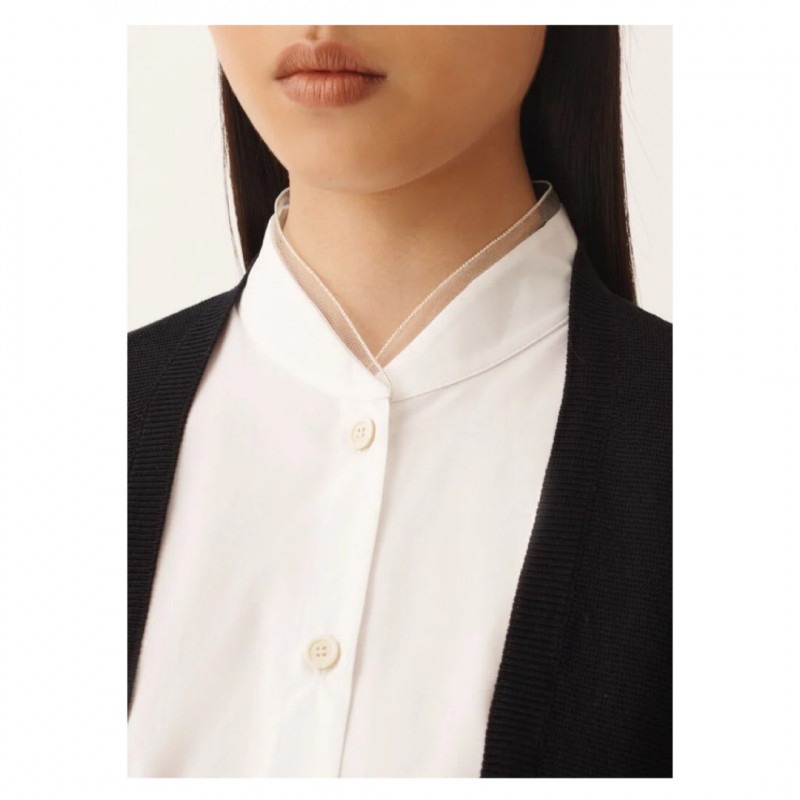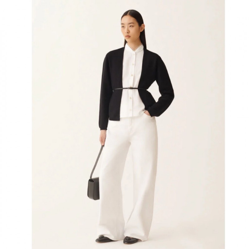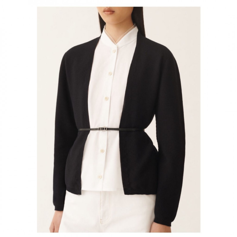 オーガニックコットン製の長袖カーディガンは、シンプルで洗練されたデザインが特徴です。ホワイトのポプリンディティールがラインの純粋さを引き立て、フェミニンで現代的なエレガンスを加えています。浮遊するダイヤモンドスレッドとレザーベルトが、貴重な軽やかさを添えて完成させます。