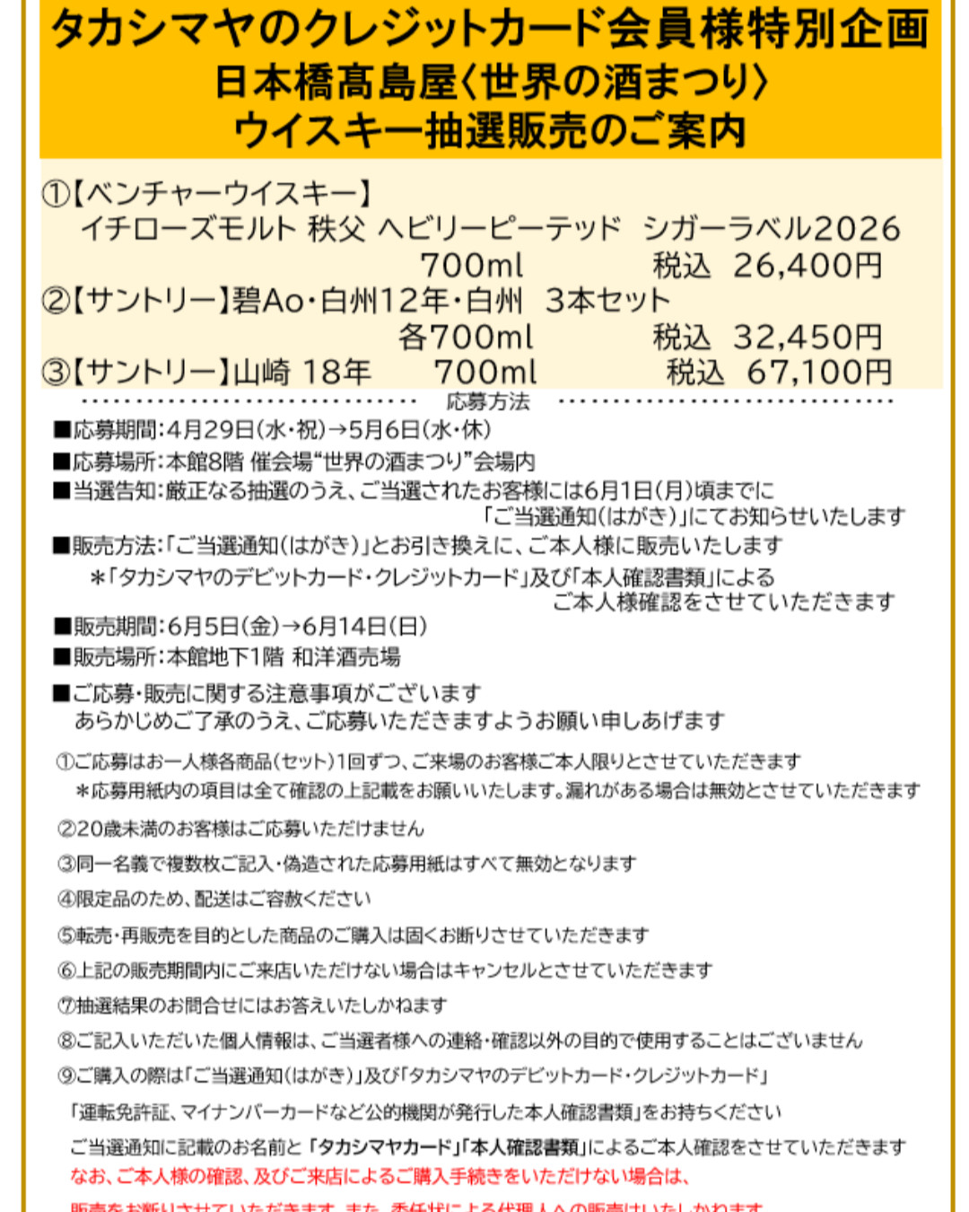 日本橋髙島屋「世界の酒まつり」ウイスキー抽選販売のご案内