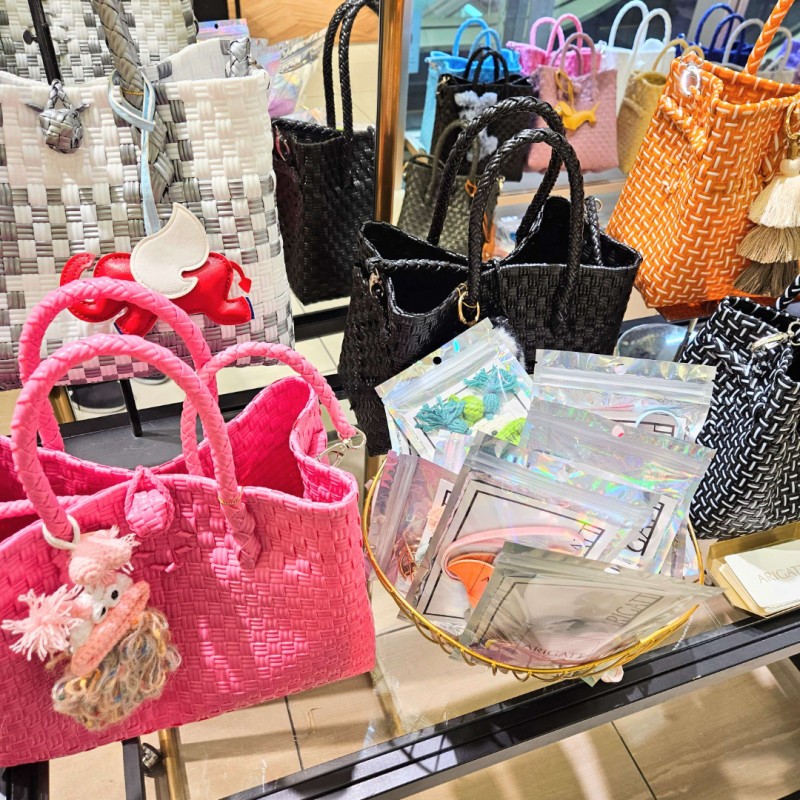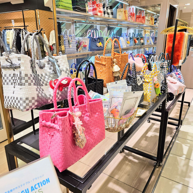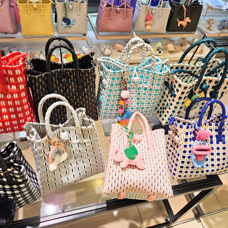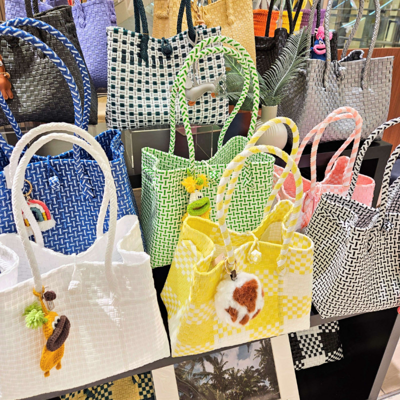 インドネシアの再生プラスチックを使い、バリ島で作られているバッグです。機械は使わず全工程人の手によって編み上げられており、丈夫で軽く汚れても自宅で洗えるため、長く大切にご愛用いただけます。