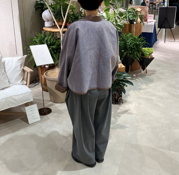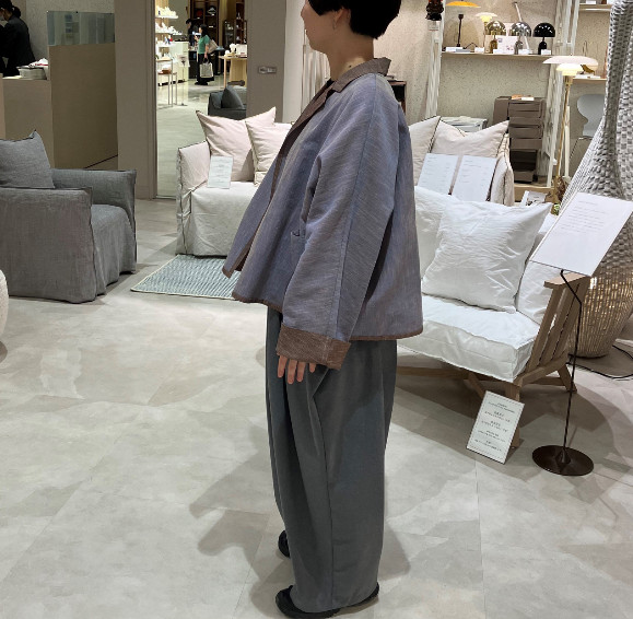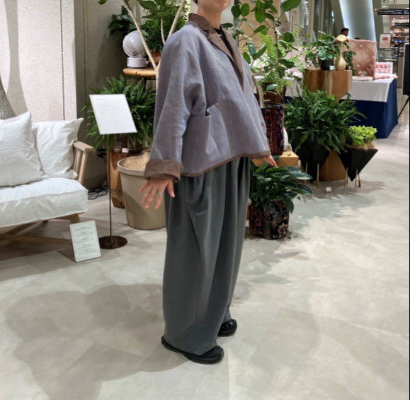 ジャケットにワイドパンツ(私物)を合わせていますが、同じ生地のワイドパンツもございます