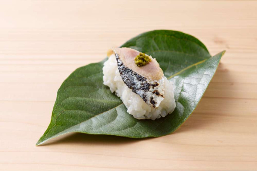 香ばしく炙ったさんまに、すりおろし柚子をのせた味わい深い秋の味覚の柿の葉すしでございます。