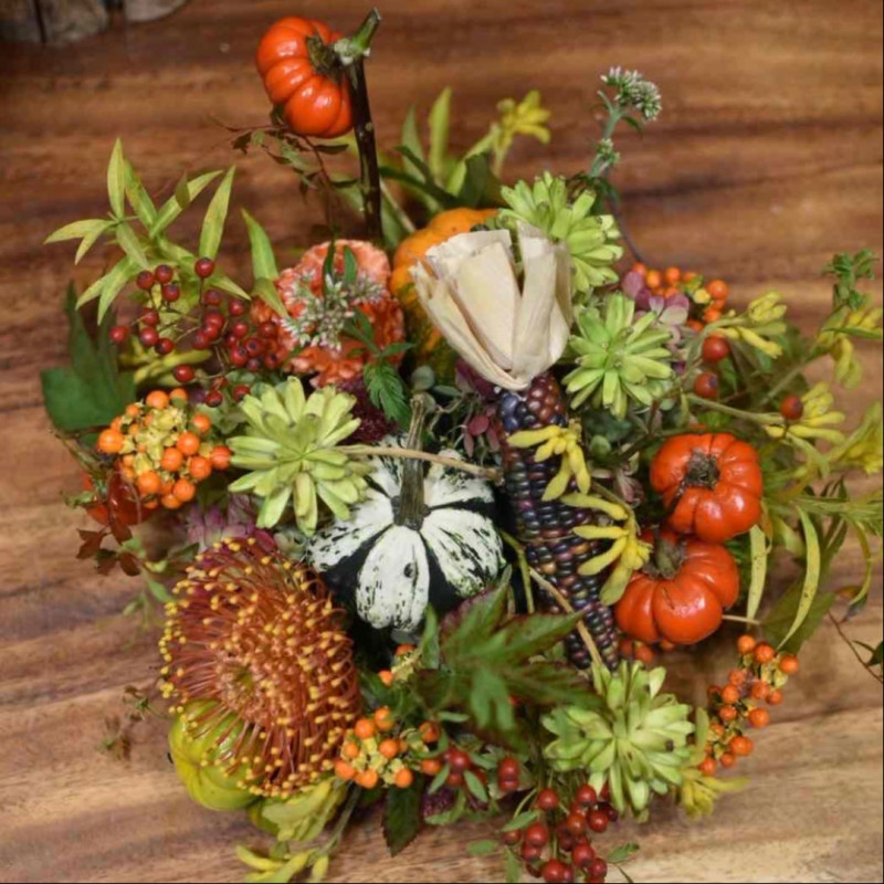 艶やかな実物や秋の花々を組み合わせた