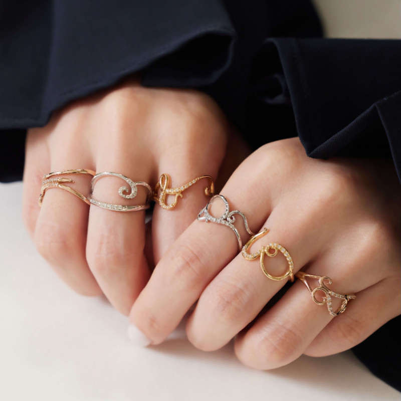 ダイヤモンドを纏った弦を指に巻き付けたような、繊細な輝きが魅力のイニシャルリングです。
