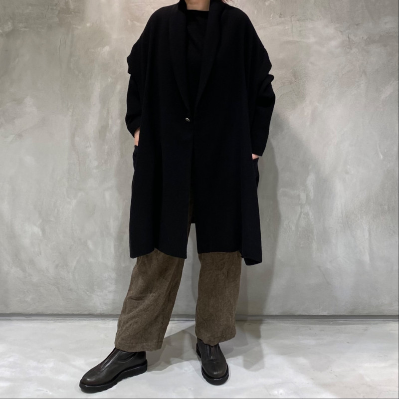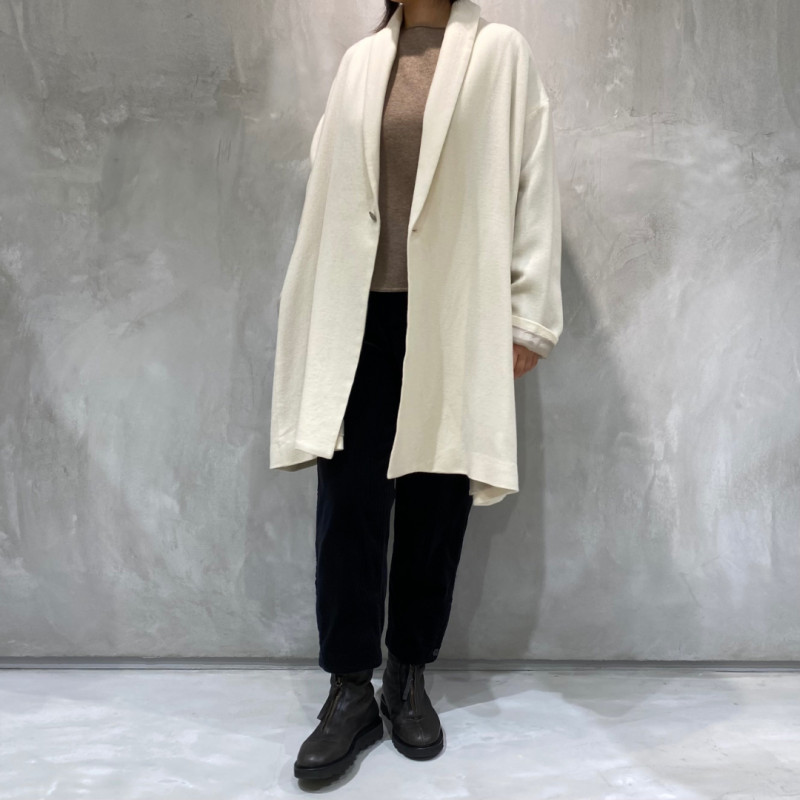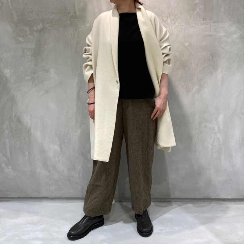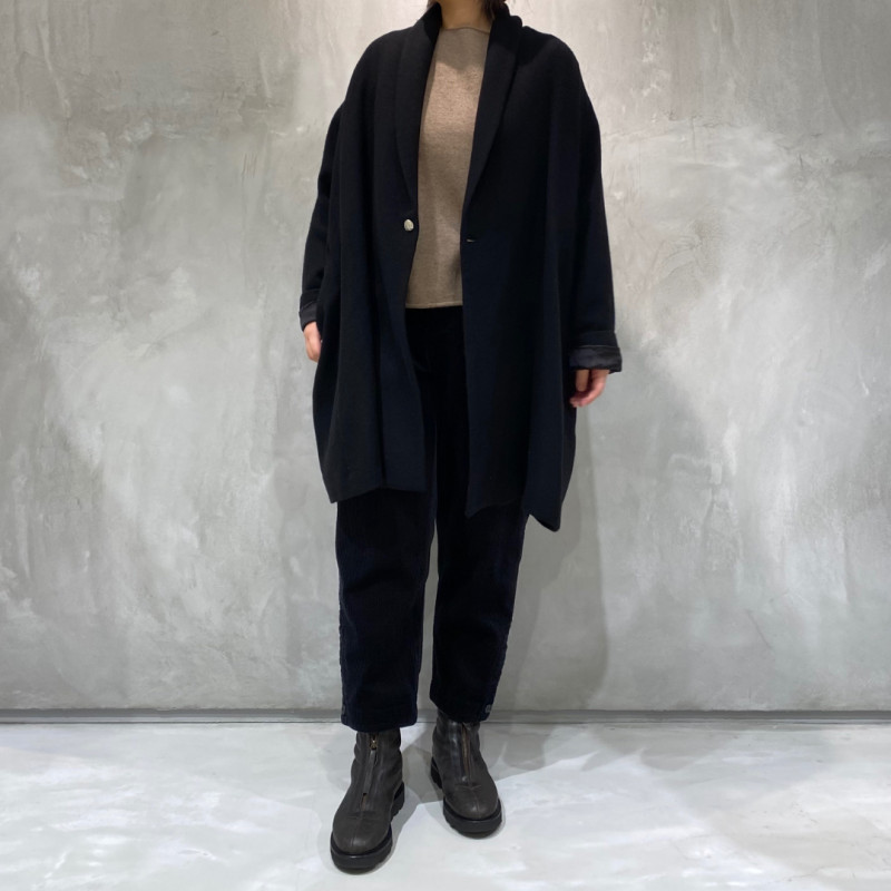 カシミヤの持つ高級感と柔らかさに、ツイル織りの丈夫さとしなやかさを兼ね備えた生地。軽さや温かさはもちろん、リラックス感のあるフォルムを醸し出します。