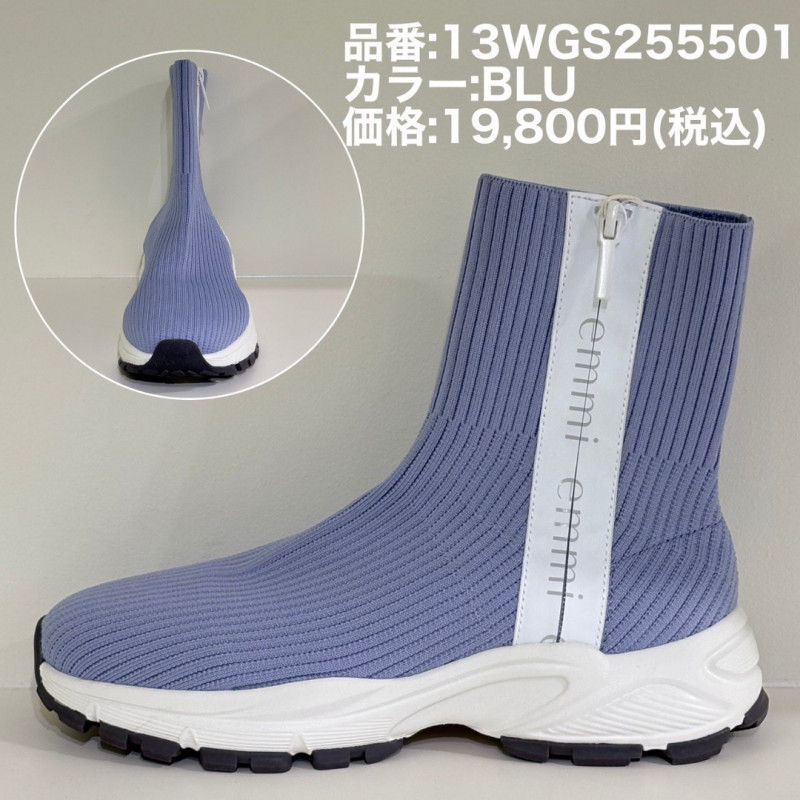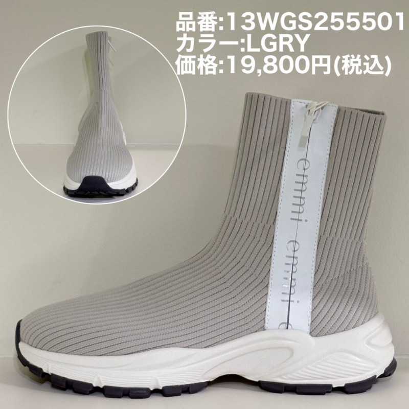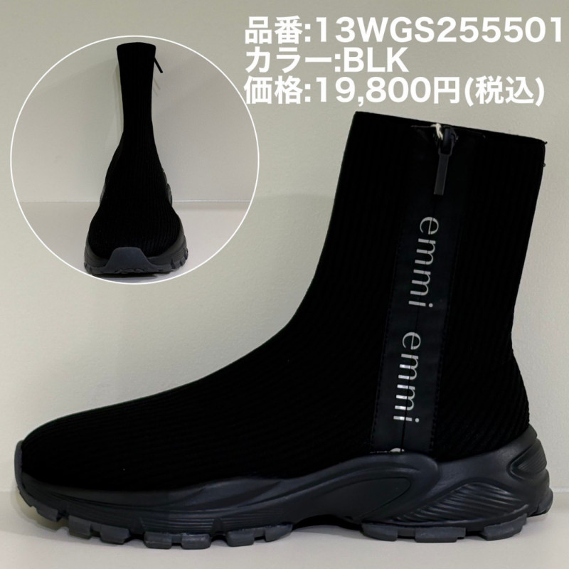 サイドには、emmiロゴを使用したファスナーを配置。軽量仕様で足取りも軽やかに、日常にも旅先にもぴったりの一足です。