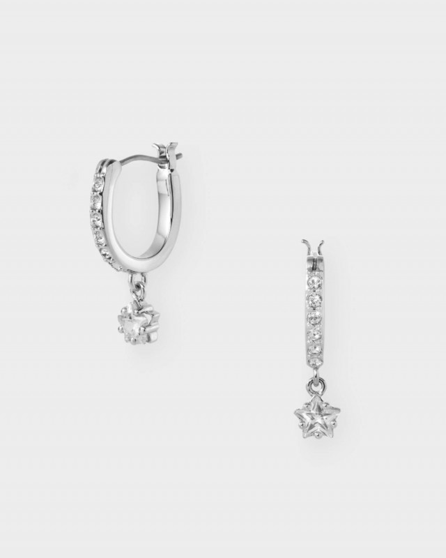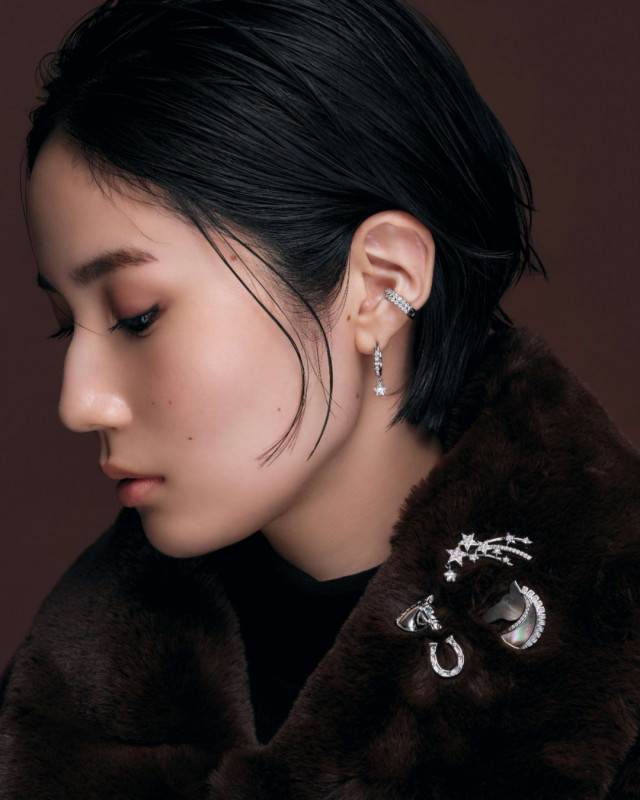 耳元には小さな星が揺れるピアスとキュービックジルコニアを敷き詰めたイヤリングをイヤーカフとしてプラス。装いを一層華やかに引き立てます。