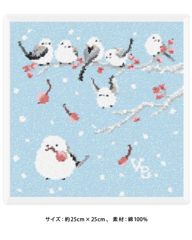 ハンカチはシマエナガが木の枝に集まり仲良く並んでいる様子を描いたオリジナルデザイン。特別感のあるアイテムは大切な方へのギフトにも最適です。