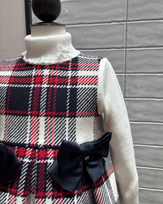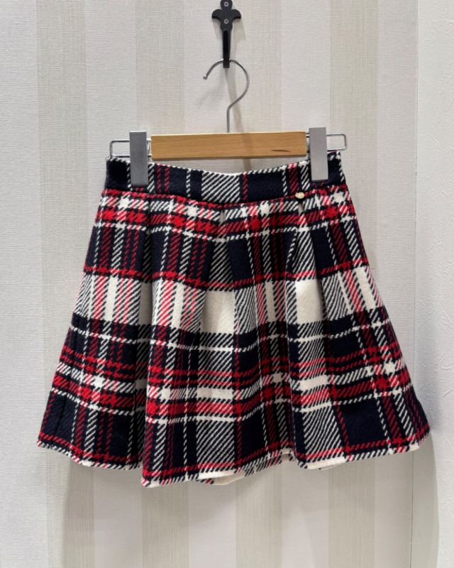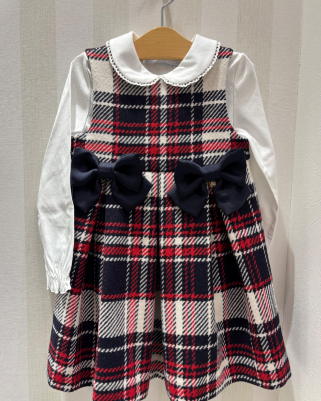 重厚感のある厚手のウール素材を使用したチェックのジャンパースカートは、ネイビー×レッド×ホワイトのカラーリングがクリスマスコーデにぴったりです。
