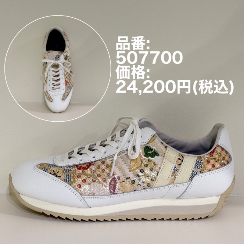 西陣織金襴をアッパーに大胆採用した数量限定モデル。金糸が織り込まれた大柄の花紋様は左右で入り方が異なり、まるで一足ずつ異なるアートピース。ホワイトレザーの補強が和の重厚さに現代的な軽さを添え、唯一無二の存在感を放ちます。