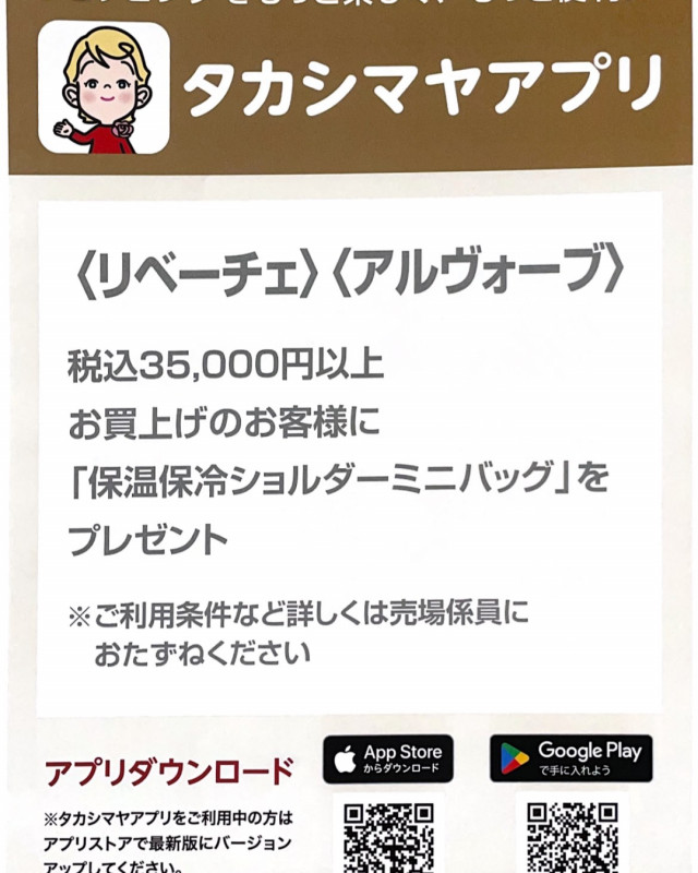 ALBOVE商品を含む税込35,000円以上お買い上げのうえ、店頭にてタカシマヤアプリクーポンをご提示頂いたお客様に、「保温保冷ショルダーミニバック」をプレゼント致します!