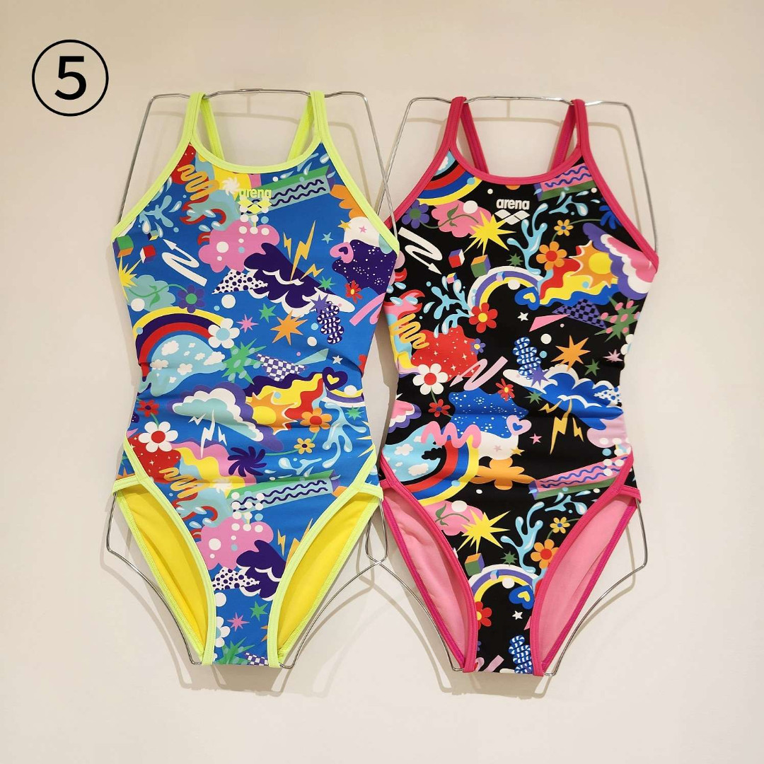 シーズンテーマのVIBRANT WEATHERのデザインで、風、雨、雷、太陽などの空のモチーフを使い天気の躍動感をポップに鮮やかな色彩で表現した水着が、