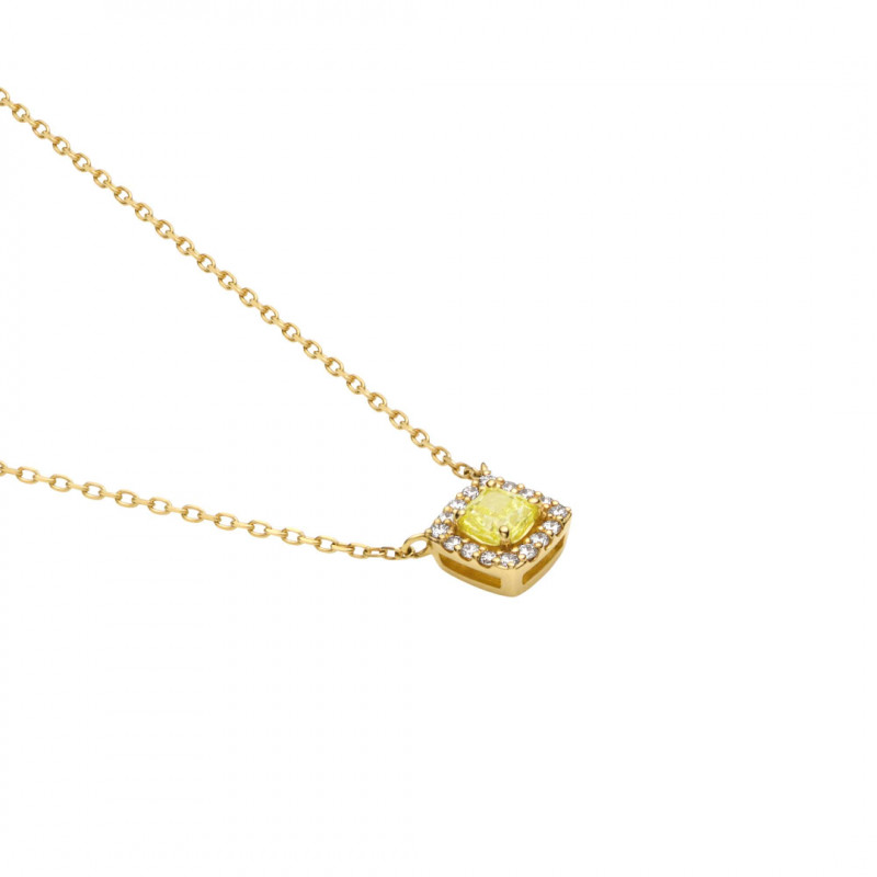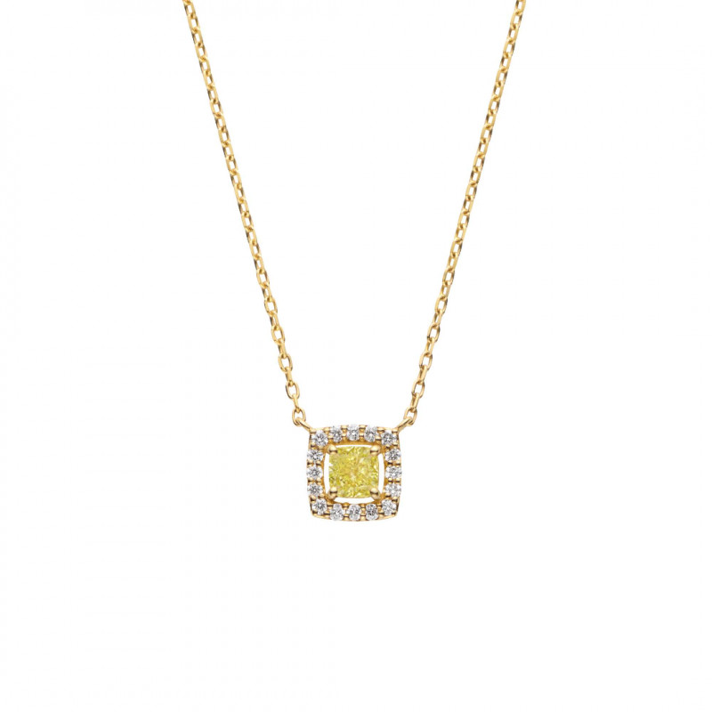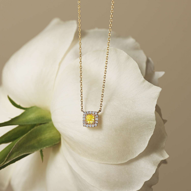 クッションカットのイエローダイヤモンドは、太陽の光のように力強く暖かみのある色と輝きを放ちます。