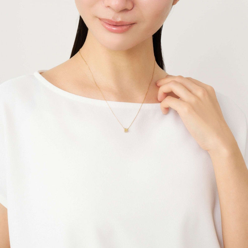 センターストーンと取り巻きのダイヤモンドの間には細い隙間を設けて、明るく鮮やかなイエローカラーを引き立てるとともに、上品で落ち着いた雰囲気に軽やかさをアレンジしています。