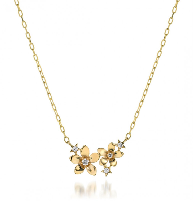 花の中心やその合間には、ダイヤモンドを「星留め」でセッティング。まるで星のブーケを纏っているかのように、可憐で繊細な花々が胸元を華やかに彩ります。