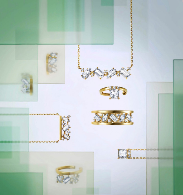 クォーツの繊細な輝きと、ダイヤモンドを幾何学模様的に組み合わせて「希望の光」を表現した“GLIMMER CLUSTER”