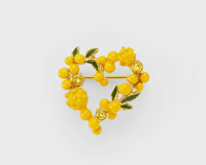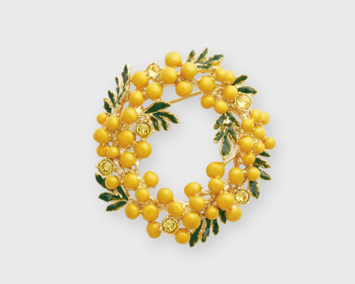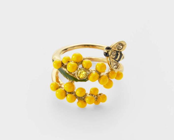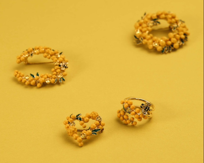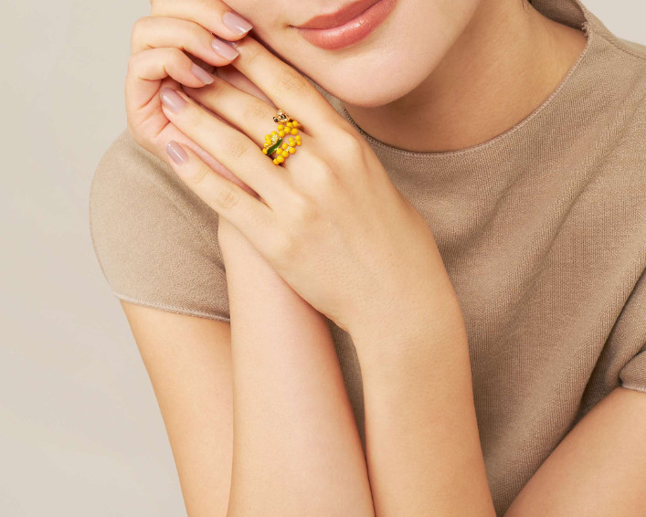 花や葉の鮮やかな色彩は、職人がひとつひとつ丁寧に色付けをしたハンドメイド。朝露のようにさりげなく輝くカットガラスが上品なアクセントに。デザイナーと職人が何度も試行錯誤を重ね、ミモザの鮮やかな色彩や繊細なフォルムをブローチやリングで再現した、クラフトマンシップ溢れるコレクションです。