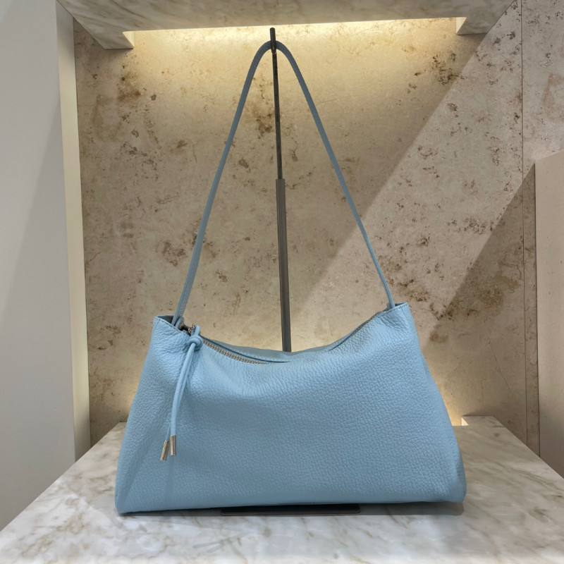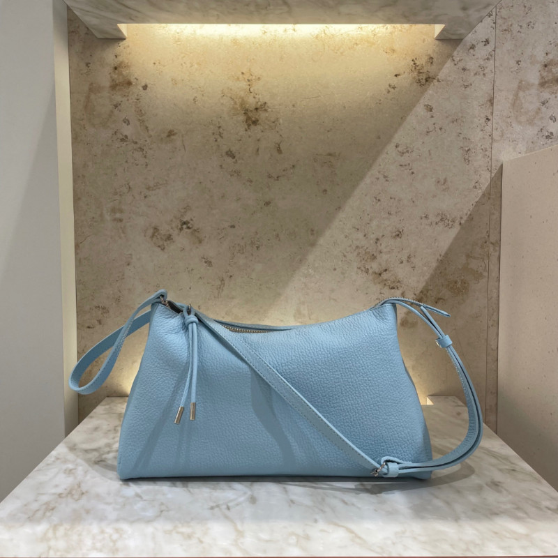 結び目デザインの引手がアクセントのレザーバッグに新色のサックスブルーが登場いたしました🩵